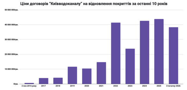 За останні десять років (з часу запуску електронної системи публічних закупівель Prozorro) “Київводоканал” назамовляв відновлення покриттів загалом на 235,4 млн гривень.