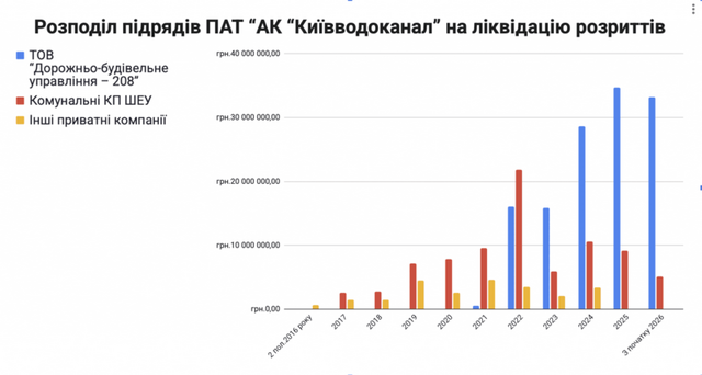 За ці роки ПрАТ “АК “Київводоканал” доручало ліквідацію розриттів 17 підрядникам. Із суттєвим відривом за загальною вартістю контрактів лідирує згадане ТОВ «ДБУ-208»: із ним підписано 71 договір на майже 129 мільйонів гривень.