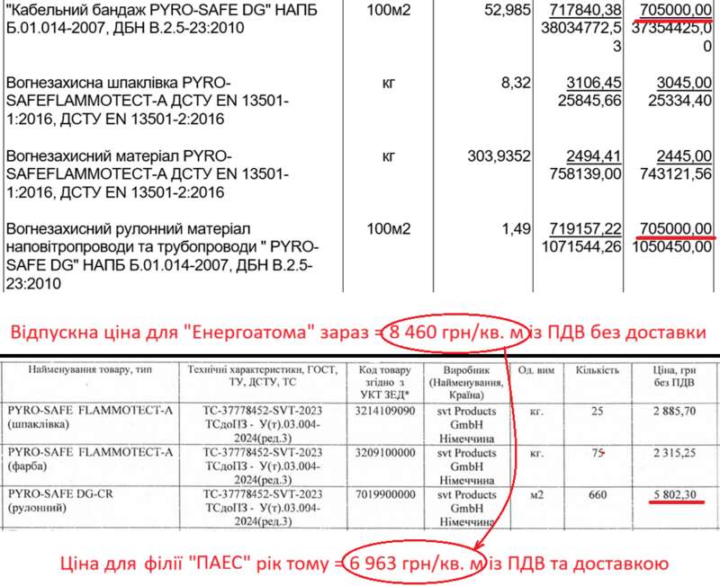 Вогнезахисна фарба Pyro-Safe Flammotect-А врахована по 2 934 грн/кг, а вогнезахисна шпаклівка Pyro-Safe Flammotect-А – по 3 654 грн/кг. Це дорівнює цінам вересневої угоди «Енергоатома» з «Атоменергоресурсом» про їхню закупівлю як товарів із доставкою.