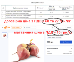 Молодий буряк замовили по 27 грн/кг (тут і далі ціни вказані з ПДВ). «Сільпо» продає його по 10 грн/кг, а Початкова школа Броварської міськради замовляла буряк по 15 грн/кг. Це в 2-3 раза дешевше.
