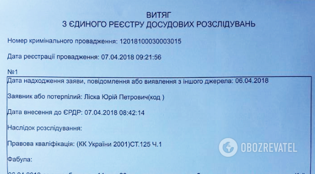 В выписке из Единого реестра досудебных расследований, которую нашим журналистам предоставил Лиска, указано, что уголовное производство открыто по ст. 125 ч.1 Уголовного кодекса Украины (нанесение легких телесных повреждений).