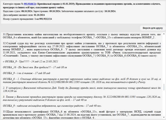 Скріншот судової ухвали по цьому слідству від 1 жовтня 2024-го