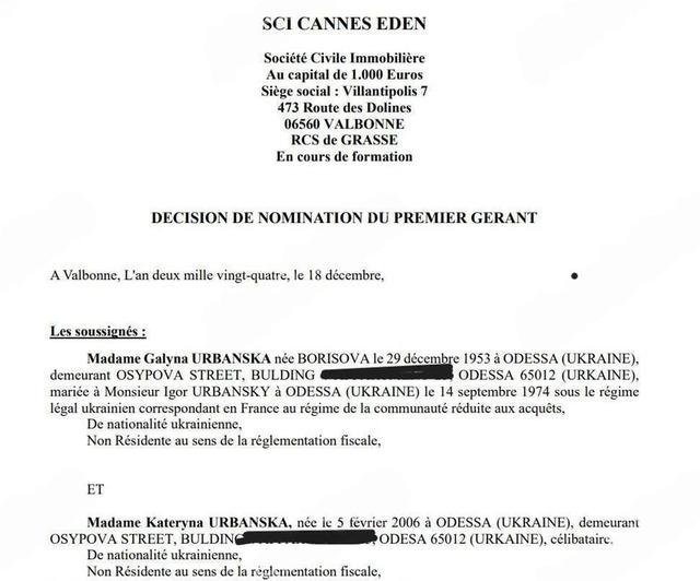 Нерухомість зареєстрована на компанію під назвою SCI Cannes Eden. Ця компанія була заснована у грудні 2024 року. 99% компанії належить Катерині Урбанській, а 1% – Галині Урбанській, матері депутата.