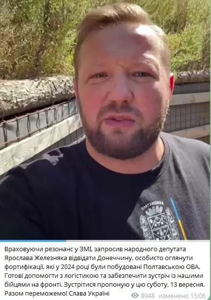 “Враховуючи суспільний резонанс, запросив народного депутата Ярослава Железняка відвідати Донецьку область і особисто оглянути укріплення, які в 2024 році були споруджені Полтавською ОВА. Ми готові допомогти з логістикою і організувати зустріч з нашими бійцями на передовій. Пропонуємо зустрітися цієї суботи, 13 вересня. Разом до перемоги! Слава Україні”, — заявив голова адміністрації.
