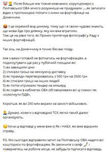 “P.S. Сьогодні ми відправили запит до Полтавської ОВА надати всі кошториси щодо укріплень. Коли закінчите з селфі та повернетеся на робоче місце, не забудьте підписати відповідь”, — підсумував депутат.