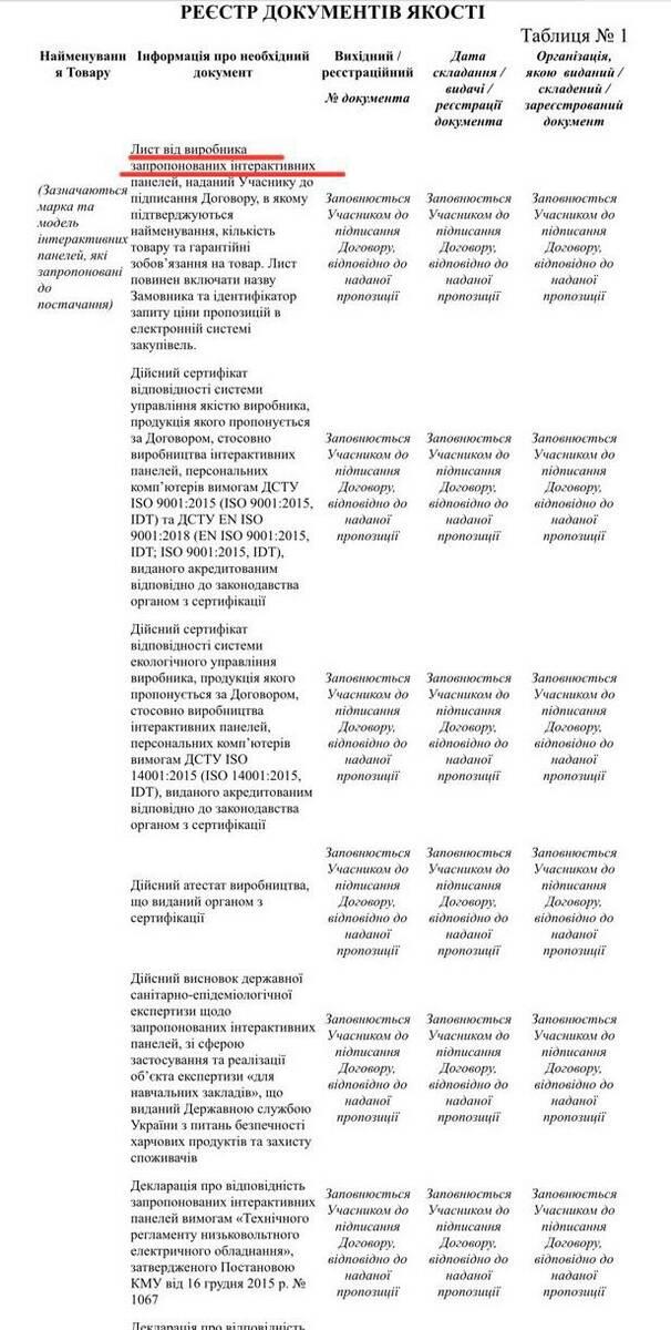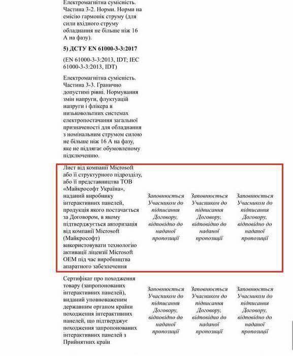 Як і під час попередніх закупівель інтерактивних панелей, у тендерній документації знову з’явилися вимоги, які не передбачені законом. Серед них: