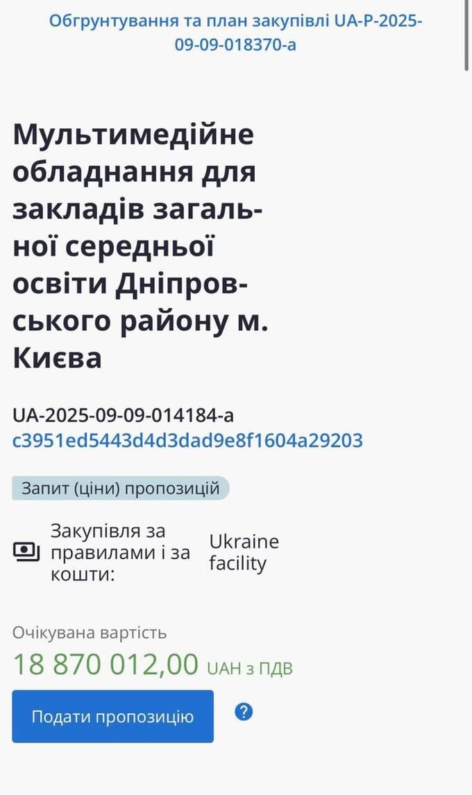 Сфера закупівель у столичній освіті продовжує привертати увагу громадськості через непрозорі умови тендерів. Цього разу мова йде про новий тендер Дніпровського управління освіти на мультимедійну техніку для шкіл на суму 18,8 млн грн.