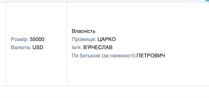 Царко задекларував 55 тис. доларів у готівці. Крім того, він має 9 банківських рахунків (8 у ПриватБанку, 1 в Універсал Банку), але залишки на них не вказані, що може свідчити про незначні суми або номінальне використання рахунків.