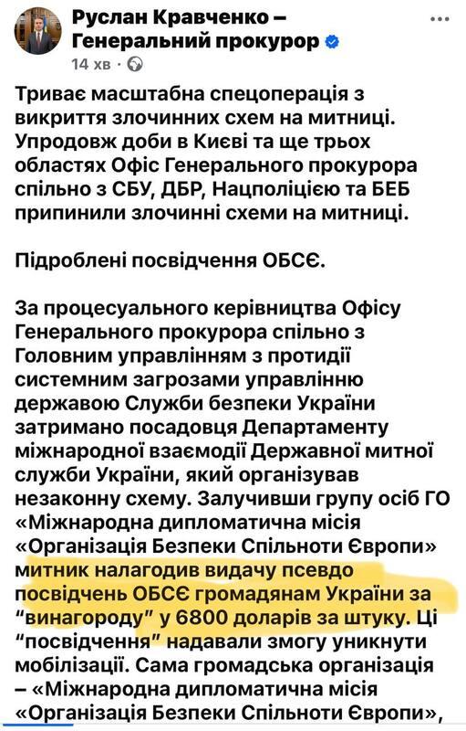 За словами Кравченка, масштабна спецоперація триває. Протягом доби у Києві та трьох областях силовики з Офісу Генпрокурора, СБУ, ДБР, Нацполіції та БЕБ ліквідували одразу кілька злочинних схем на митниці.