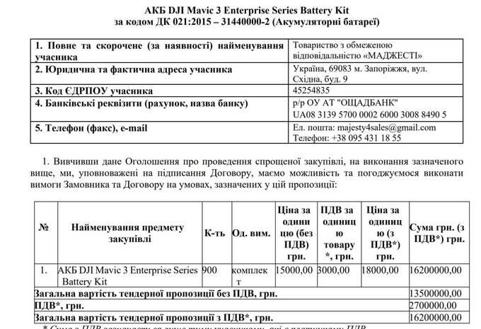 У липні ДПСУ оголосило про закупівлю 900 акумуляторних батарей DJI Mavic 3 Enterprise Series Battery Kit на орієнтовну вартість майже 19,4 млн гривень. На торги записалося багато учасників: ТОВ “Маджесті”, ТОВ “Акоптерс”, ТОВ “М-агро”, ТОВ “Кальхеон”, ТОВ “М-17”, ТОВ “Амтрікс” та ТОВ “Торгівельна компанія СЕК”.