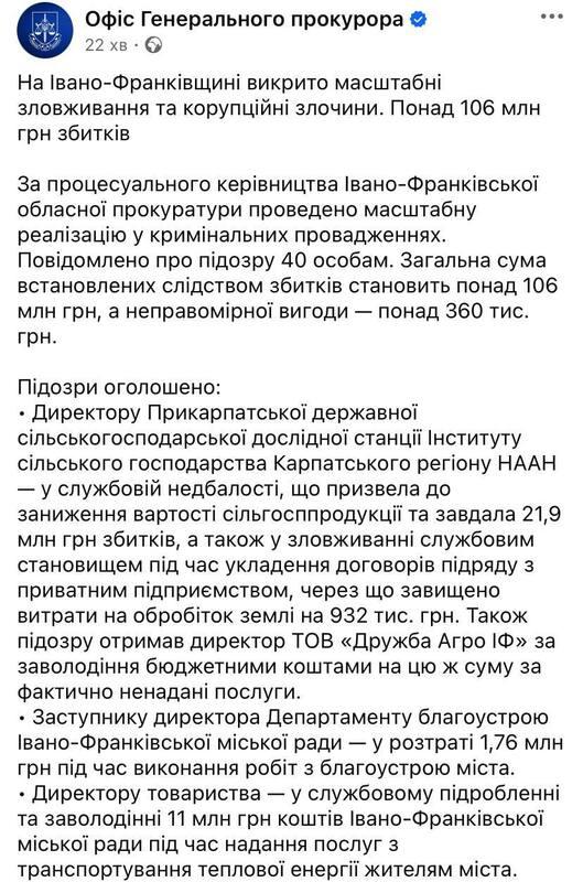 Прокуратура пред’явила 40 підозр посадовцям, залученим до розкрадання понад 106 млн грн.