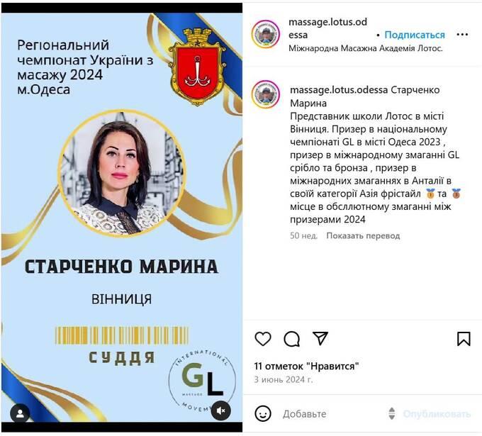 На сторінці масажистки-тренерки Старченко ми можемо побачити, де саме можна знайти її студію. Це, щоправда, не вулиця Зодчих, але дуже поруч – це вул. академіка Ющенка, 16, прим. 172. Воно належить саме Марині Старченко. За які гроші вдалося придбати немаленьке приміщення у дорогому районі Вінниці – питання.