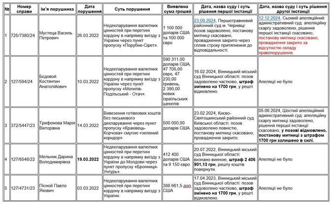 На відміну від історій Мустеци та Бєдового, у її випадку суди були на боці митниці: за спробу вивезти 500 000 у березні апеляція підтвердила порушення і штраф у 1 700 грн, а за червневий епізод суд виніс Марії Трифоновій штраф у 832 000 грн.