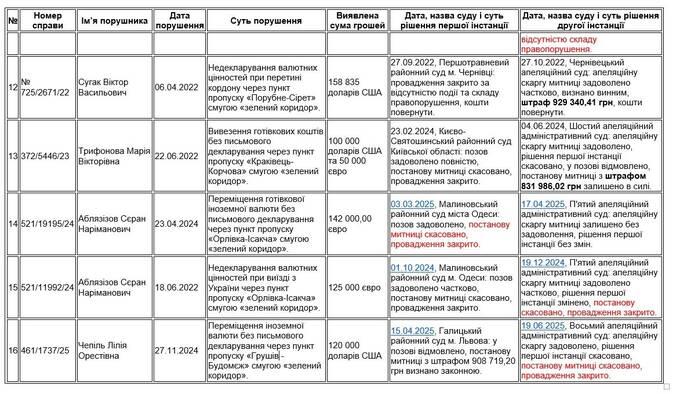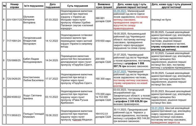 Саме судові рішення в цих справах дають нам уявлення про обсяги недекларування валюти та вказують на деякі прізвища порушників.