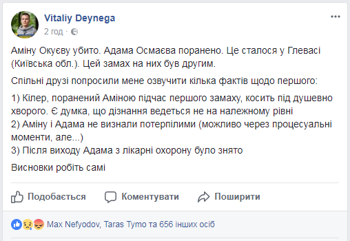 “Есть мнение, что дознание ведется не на должном уровне. Амина и Адам не признаны потерпевшими (возможно через процессуальные моменты, но… После выхода Адама из больницы охрану сняли”, – рассказал он.