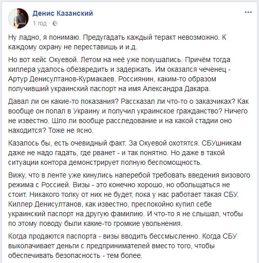 “Вижу, что в ленте уже кинулись наперебой требовать введения визового режима с Россией. Визы – это конечно хорошо, но обольщаться не стоит. Никакого толку от них не будет, пока у нас работает такая СБУ. Киллер Денисултанов, как известно, преспокойно купил себе украинский паспорт на другую фамилию. И что-то я не слышал, чтобы по этому поводу были какие-то громкие увольнения.