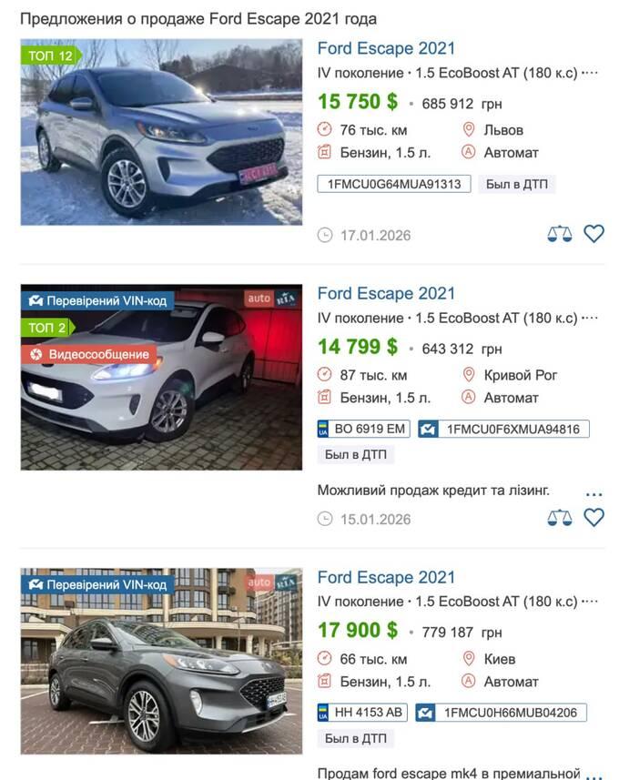 За інформацією з ринку вживаних автомобілів в Україні, ринкова ціна Ford Escape у хорошому стані на початок 2026 року становить від 650 до 950 тис. грн, залежно від комплектації, пробігу та технічного стану.