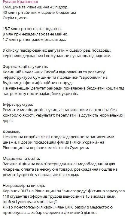Про це повідомив генеральний прокурор Руслан Кравченко. Він зазначив, що загалом у двох регіонах було оголошено про 45 підозр, зокрема: