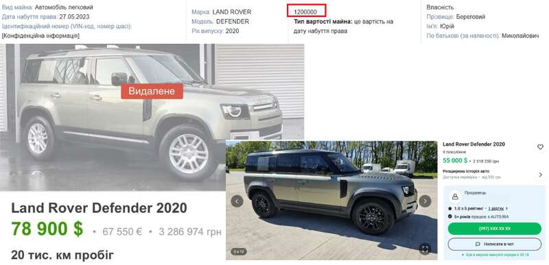 Привертає увагу той факт, що перелік майна родини Берегових суттєво виріс від початку повномасштабного вторгнення. Зокрема, у 2023-му році Юрій Береговий став власником автомобіля Land Rover Defender 2020 року випуску. У своїй декларації посадовець вказав, що придбав автівку за 1,2 млн гривень. Тоді як журналісти знайшли архівне оголошення про продаж цієї автівки на той момент на одному з сайтів з продажу. Тоді за неї просили майже 79 тисяч доларів США, що еквівалентно 2,9 млн гривень по тогочасному курсу. Відповідно, більш як вдвічі більше ніж зазначено в декларації.