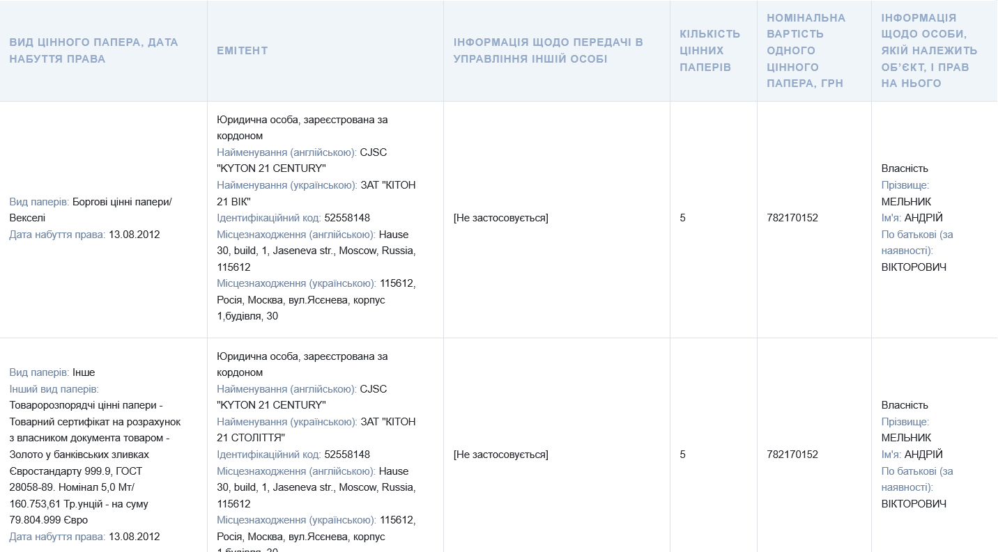 Російська ж компанія вказана емітентом цього золота. Це, ймовірно, може означати, що вона і випустила цінні папери, які дають Мельнику право на 5 тонн золота.